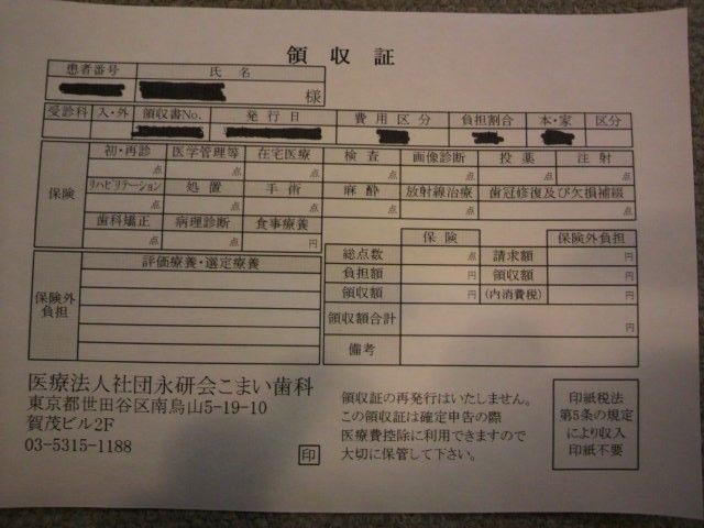 毎回お渡しする領収書は色々な保険請求点数ごとに区分し表示しています。